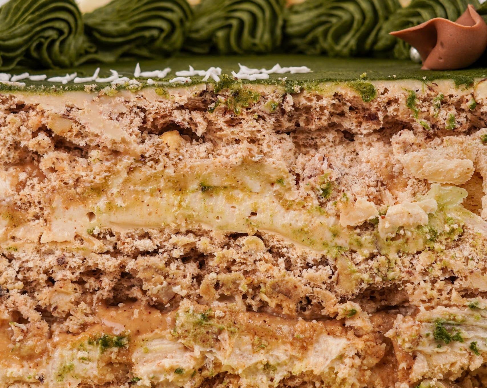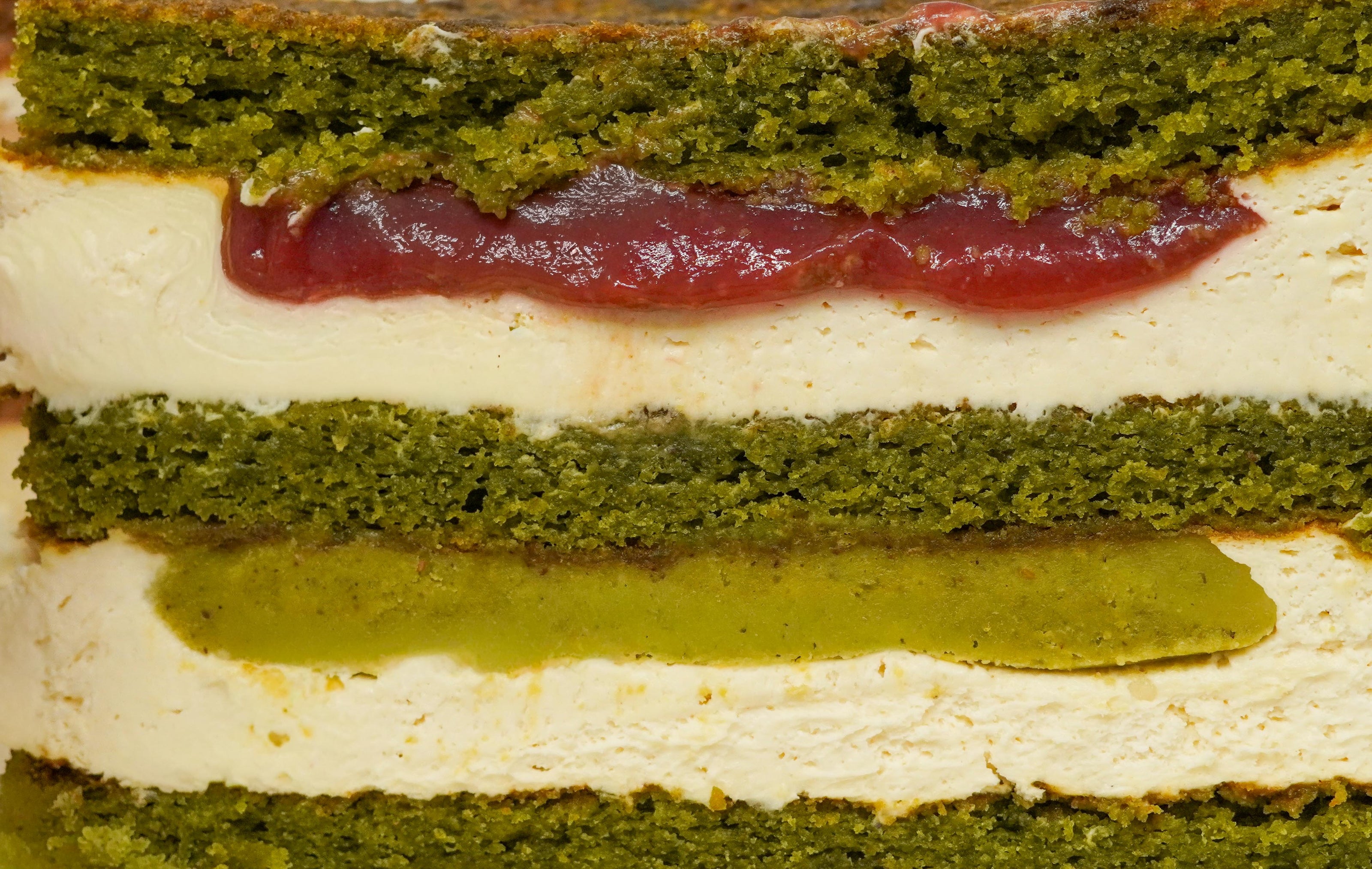 Pistachio sponge cake, berry compote, rich pistachio cream and pistachio mousse.