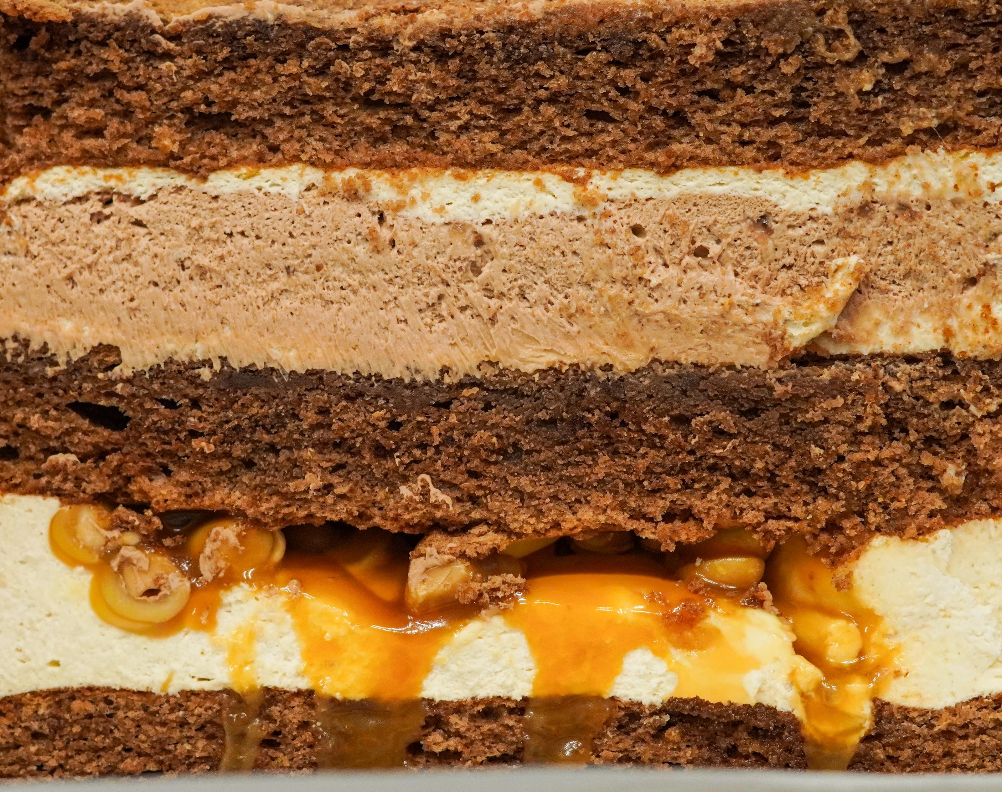 Moist chocolate sponge layered with silky dark chocolate ganache, flowing peanut caramel, and crunchy caramelised peanuts. A perfect balance of bitterness and sweetness