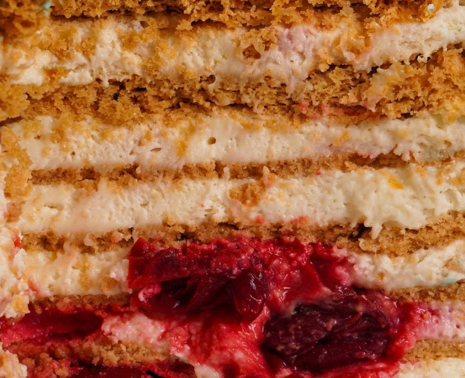 Milk chocolate sponge layered with cherry compote, light vanilla cream, rich chocolate brownie and a smooth cheesecake layer.