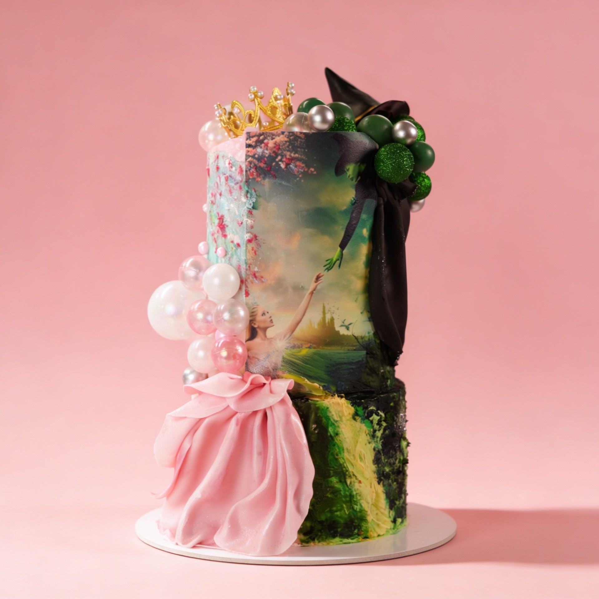 A large, extra-tall custom-themed cake that can be designed around any of your favorite cartoons, movies, or other themes. This size and style includes handmade fondant figures, non-edible elements, and printed pictures. The starting price of the cake is listed below. Any additional elements can be discussed and may incur extra charges.